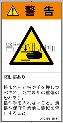 指や手を入れないこと。清掃や保守作業前に機械を停止すること。