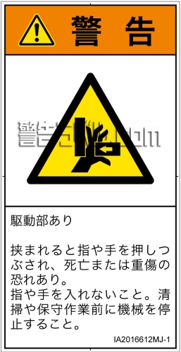 指や手を入れないこと。清掃や保守作業前に機械を停止すること。