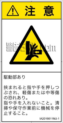 指や手を入れないこと。清掃や保守作業前に機械を停止すること。