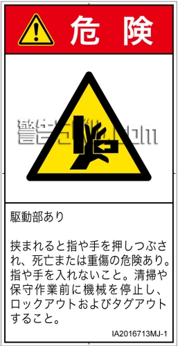 指や手を入れないこと。清掃や保守作業前に機械を停止し、ロックアウトおよびタグアウトすること。
