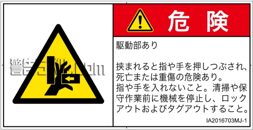 指や手を入れないこと。清掃や保守作業前に機械を停止し、ロックアウトおよびタグアウトすること。
