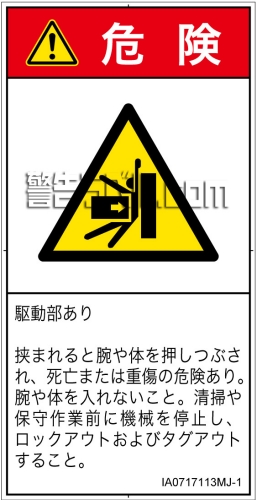 腕や体を入れないこと。清掃や保守作業前に機械を停止し、ロックアウトおよびタグアウトすること。