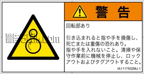 指や手を入れないこと。清掃や保守作業前に機械を停止し、ロックアウトおよびタグアウトすること。