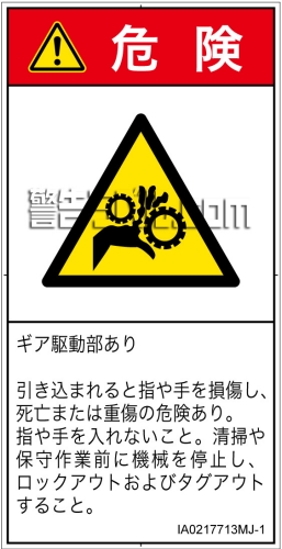 指や手を入れないこと。清掃や保守作業前に機械を停止し、ロックアウトおよびタグアウトすること。