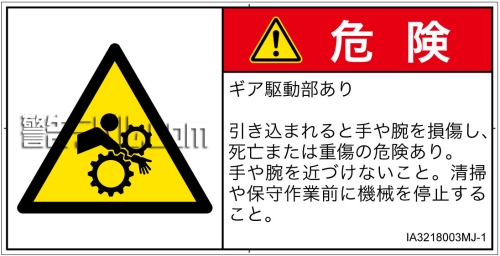 引き込まれると手や腕を損傷し、死亡または重傷の危険あり。