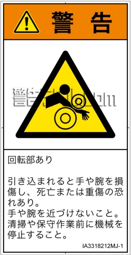 引き込まれると手や腕を損傷し、死亡または重傷の恐れあり。