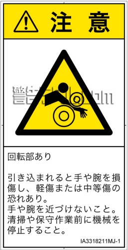 引き込まれると手や腕を損傷し、軽傷または中等傷の恐れあり。