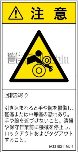 引き込まれると手や腕を損傷し、軽傷または中等傷の恐れあり。