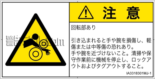 引き込まれると手や腕を損傷し、軽傷または中等傷の恐れあり。