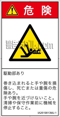 巻き込まれると手や腕を損傷し、死亡または重傷の危険あり。
