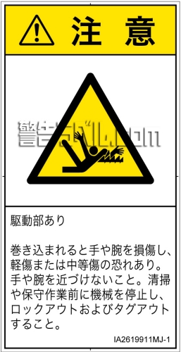 巻き込まれると手や腕を損傷し、軽傷または中等傷の恐れあり。