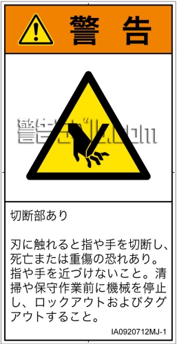 指や手を近づけないこと。清掃や保守作業前に機械を停止し、ロックアウトおよびタグアウトすること。