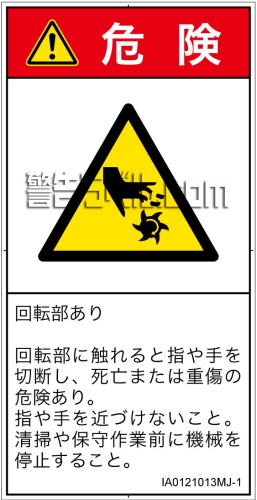 回転部に触れると指や手を切断し、死亡または重傷の危険あり。