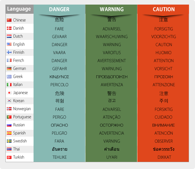 警告ラベルは、原則として、使用国の公用語で記載する必要があります。したがって、シグナルワードも各言語での表示が必要となりますが、ISO、ANSI、SEMIなどの規格によって表現が異なる場合がありますので、注意が必要です。