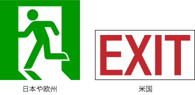 さらに日本や欧州では日常的に見られる非常口のシンボルも、米国(「ANSI Z535.3-2007」)では理解度試験に合格していないとされているため、白地に赤か緑で大きく「EXIT」という文字があるだけです。