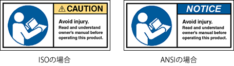 下図(左)のラベルは「ISO 3864-2」のAnnex Cに掲載されているサンプルですが、これを同じ内容で米国向けにする場合は、下図(右)のようになります。