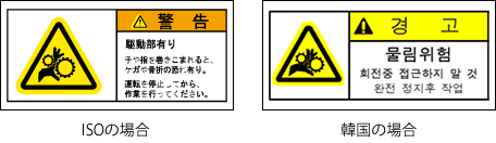 例えば、下図(左)の「ISO 3864」の巻き込まれに関する警告ラベルを韓国版にすると、下図(右)のようにシグナルワード部は黄色の背景に「警告」となります。