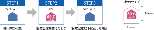 ※「温度警告ラベル」は、50℃ 以上になると色の変化によって警告できるよう、示温性インクを採用しています。